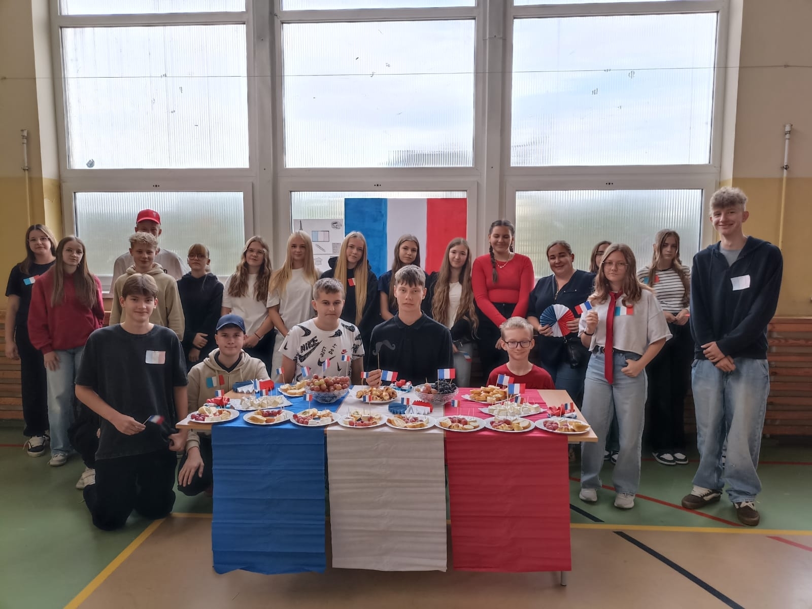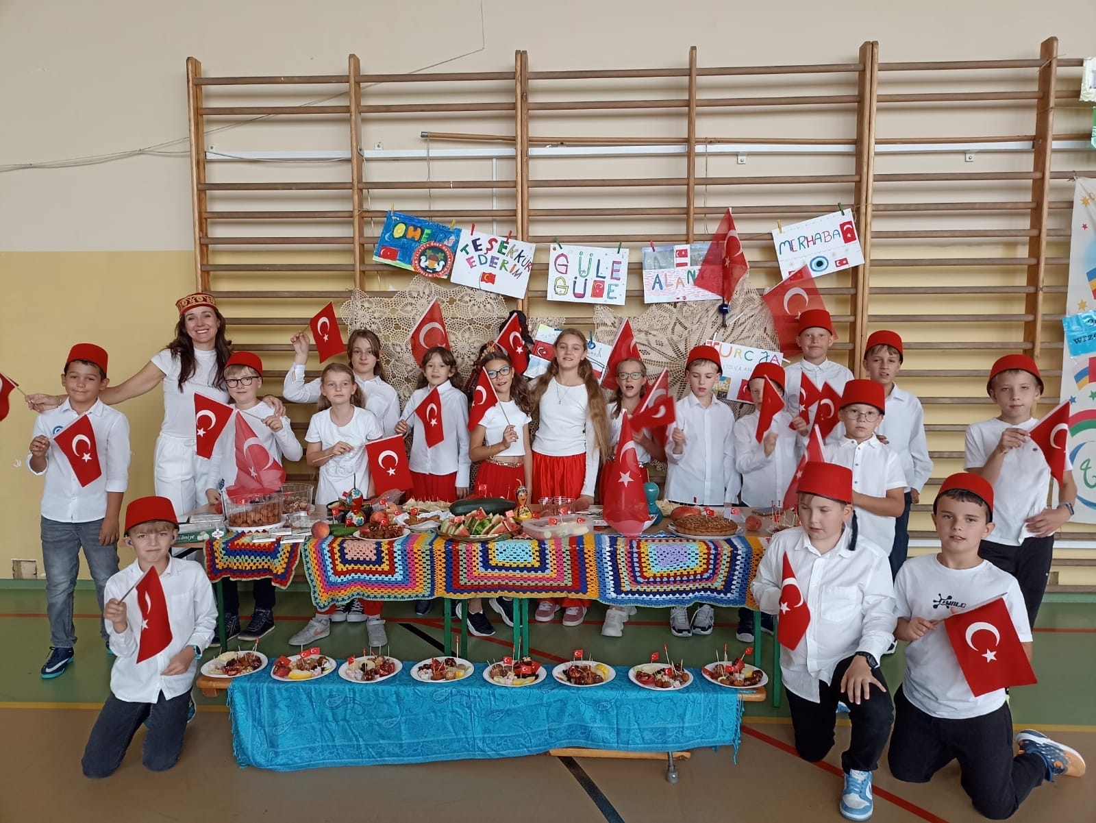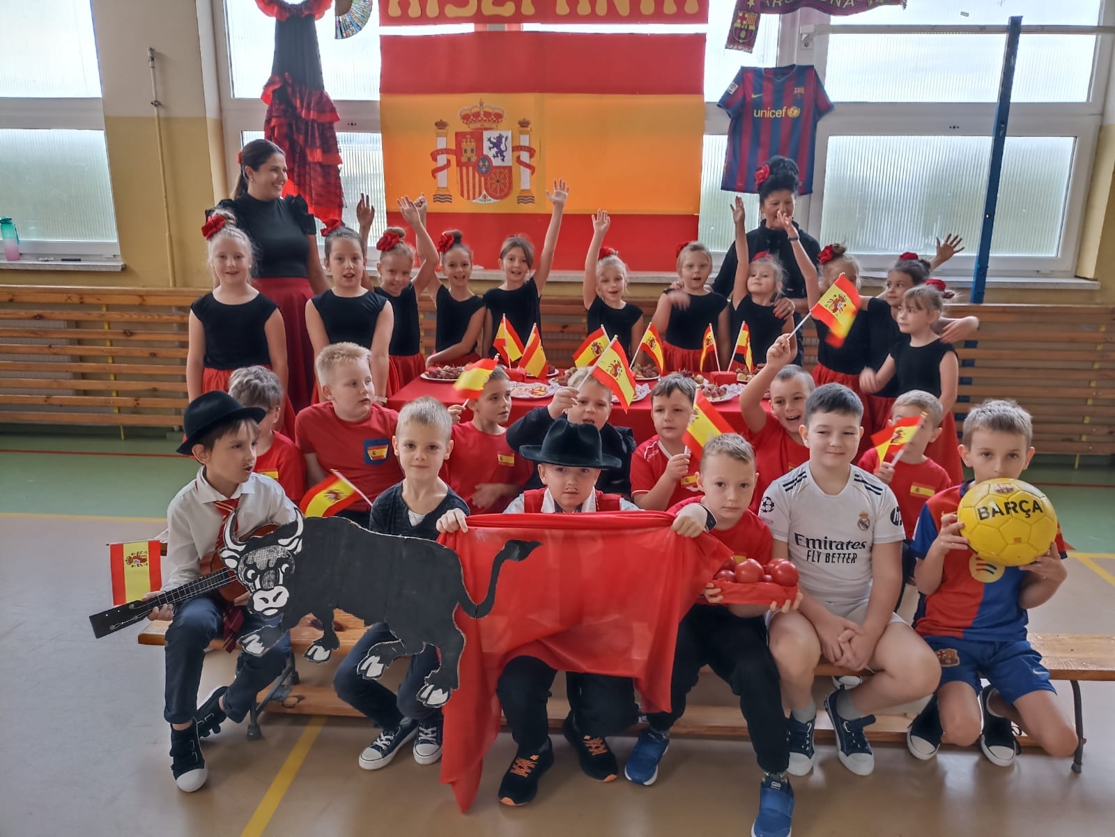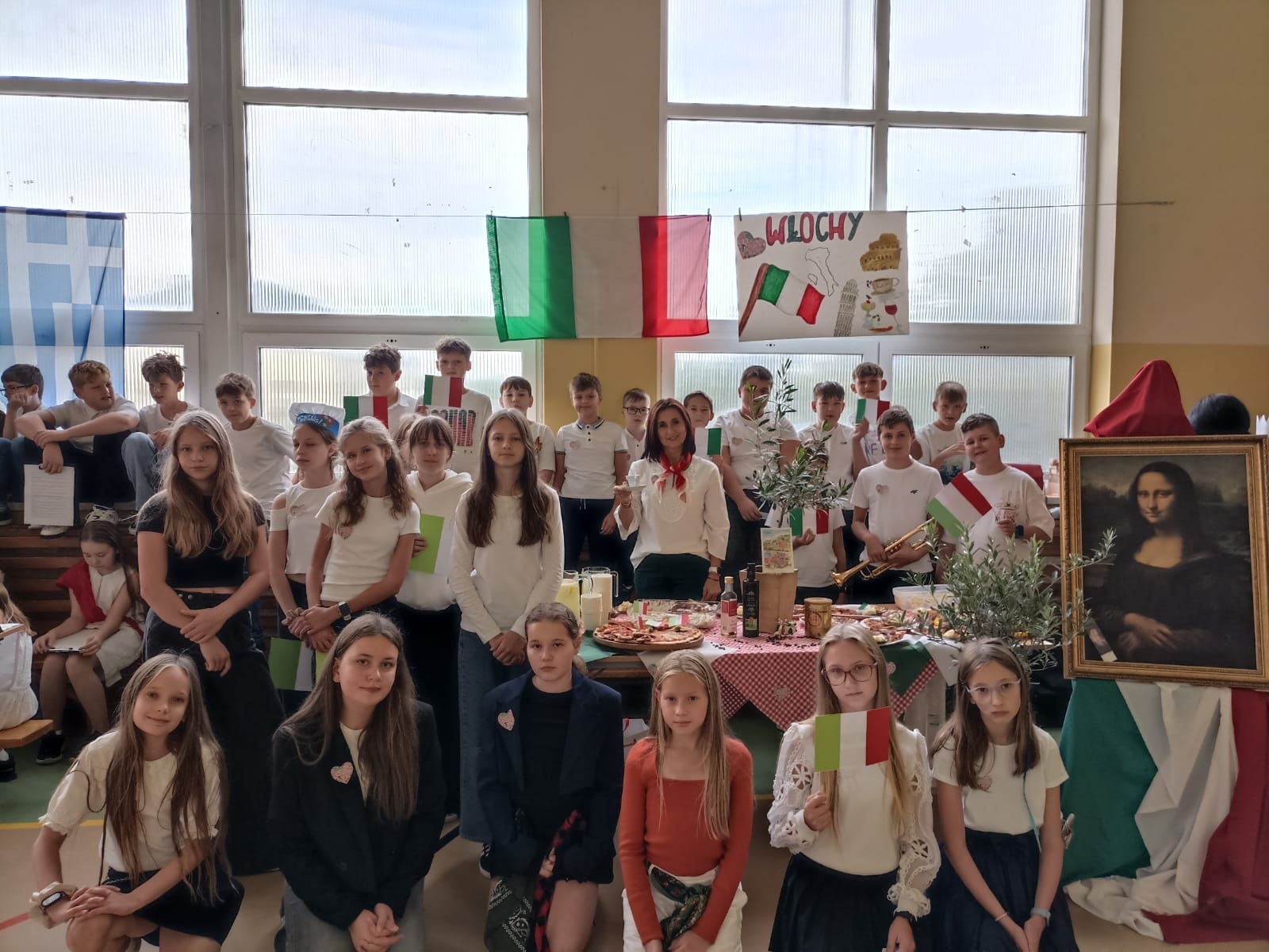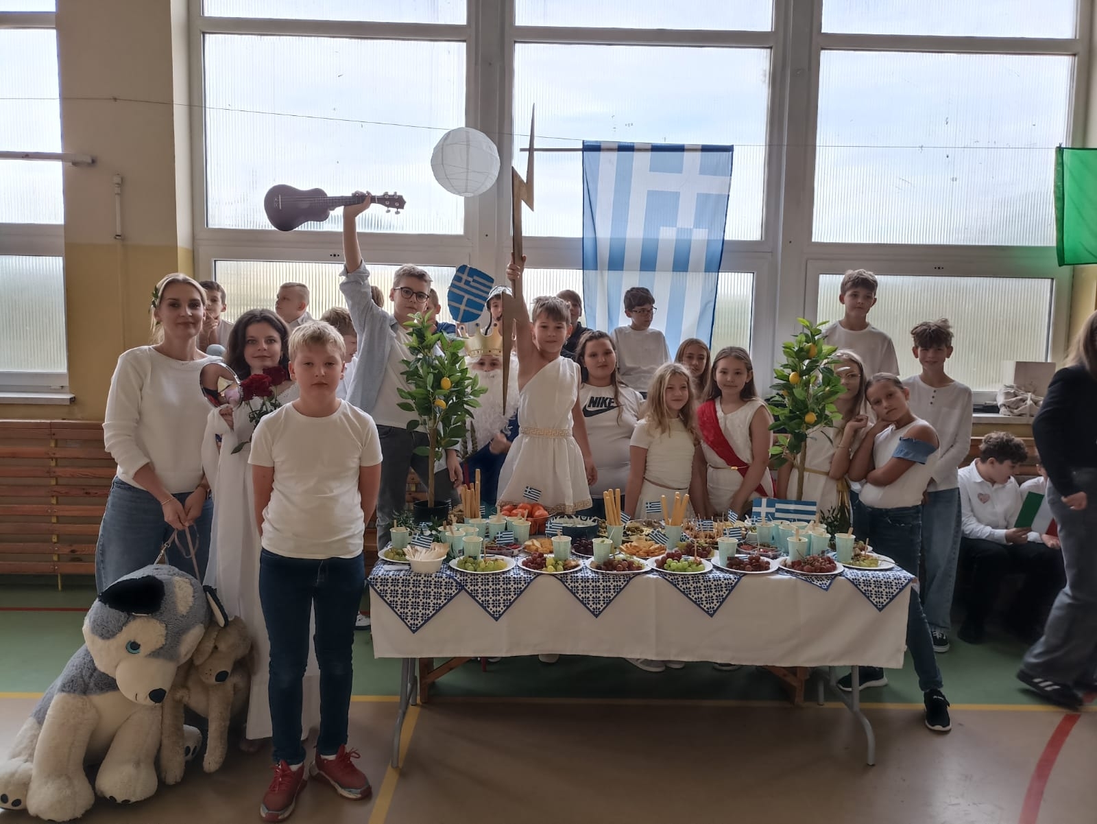 Każda klasa zaprezentowała wylosowany kraj, przygotowując ciekawy program artystyczny. Mogliśmy usłyszeć charakterystyczne zwroty w obcych językach, podziwiać narodowe tańce i stroje, a także spróbować tradycyjnych potraw. Stoły kusiły różnorodnością smaków i dekoracji – pojawiła się nawet egzotyczna roślinność, jak pachnące cytryny i oliwki, które przeniosły nas wprost do słonecznego południa Europy. 🌿🍋